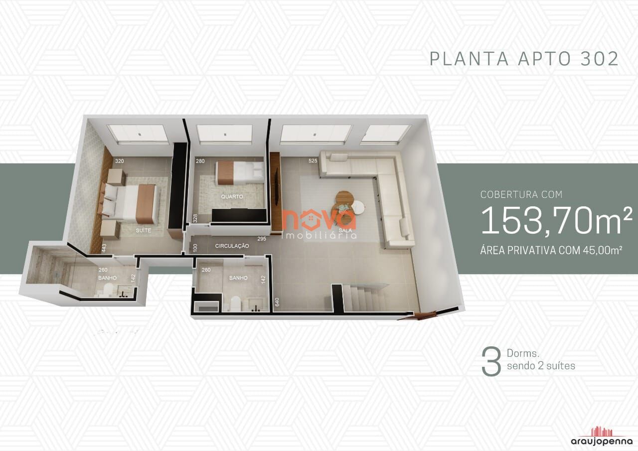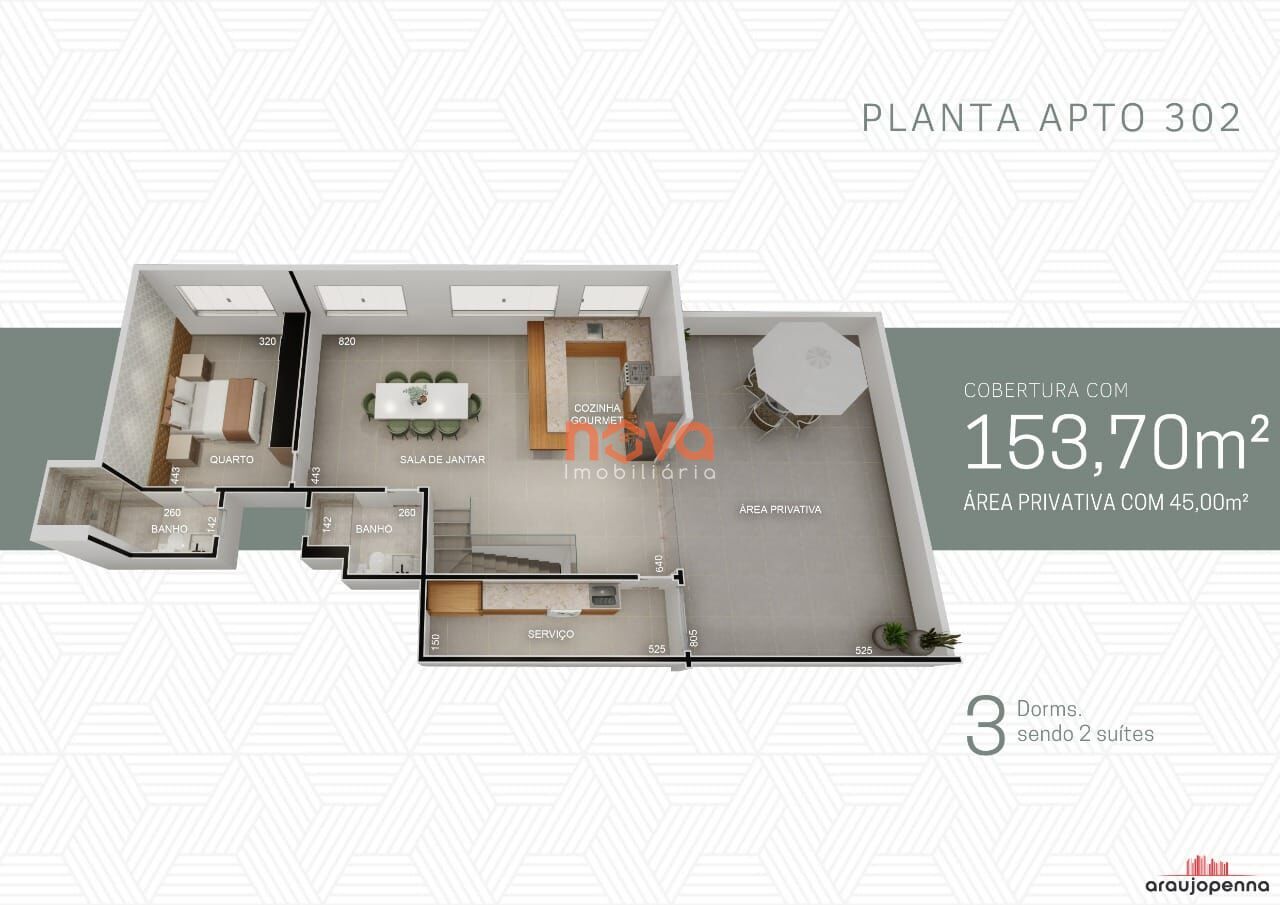 Ainda conta com os 3 quartos bem distribuídos, sendo duas suítes com ótimo espaço e dois banheiros privados.